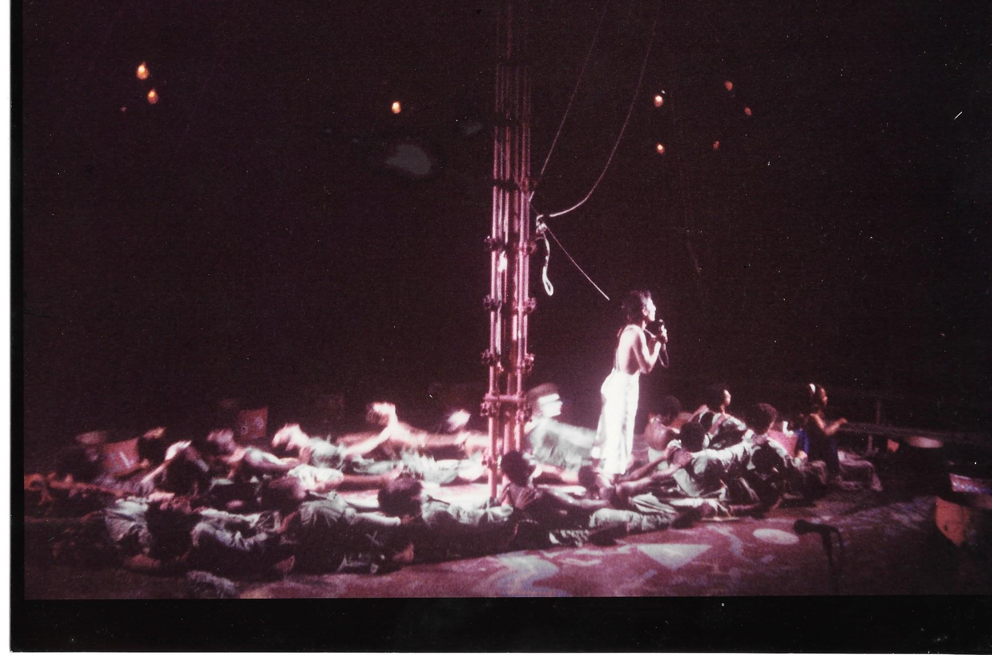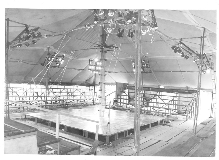 Our stage was twenty (20) feet X twenty (20) feet square. The stage was one (1) foot high, off the ground, constructed around the Tent’s Center Pole. It was built in sections so as to be modular (we could un-bolt the sections when we needed to move). Each stage module was made of one and one-half inch angle iron. We used a triple-material stage floor. The lowest level (the “foundation”) was three-quarter dense and heavy marine plywood, covered with half-inch Celotex. This was covered with Hardboard (Masonite), with the smooth side up giving us an exceptional stage floor, which the dancers particularly liked. The stage floor was very sturdy and could take more than 25 people jumping and dancing simultaneously while having the right amount of “Bounce” or “Give”.